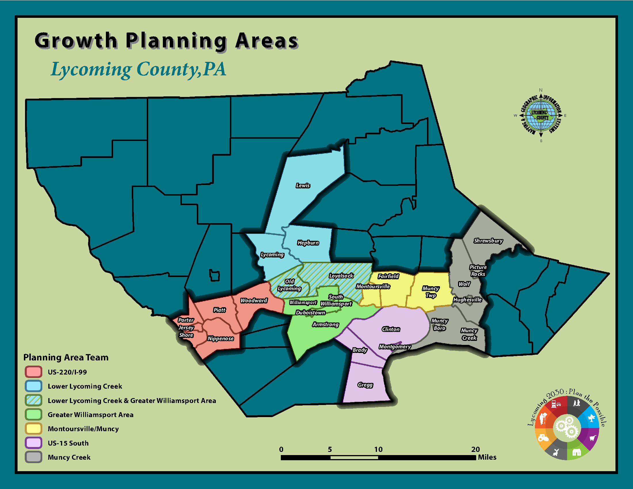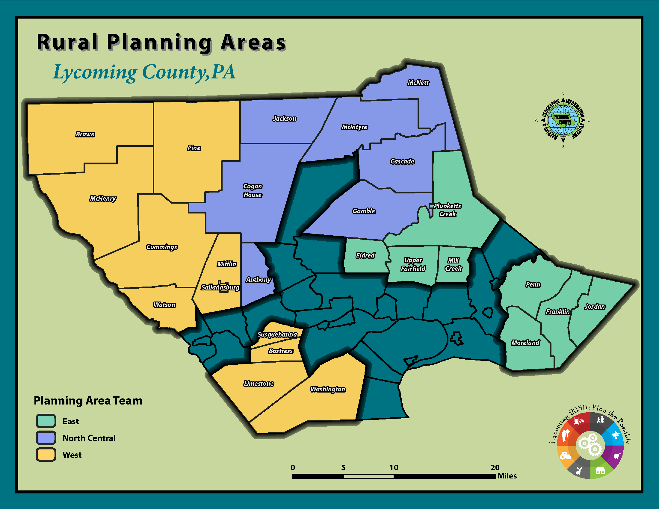 In 2015, the Lycoming County Planning Department began coordinating with local stakeholders including municipal officials, local water & sewer authorities, schools, public safety officials, local business owners, and many others to update 6 Multi-Municipal Comprehensive Plans originally adopted in 2005. These plans identify the priority issues for each multi-municipal planning area as identified by the Planning Area Team (comprised of mostly local government stakeholders, community stakeholders, and public service providers). The plans also identify top projects designed to address the priority issues identified by the Planning Area Teams. The final product is an implementable multi-municipal comprehensive plan which municipal officials and community stakeholders can easily use while completing their top projects. Final plans and meeting materials for the Multi-Municipal Planning Areas can be found at the links below.