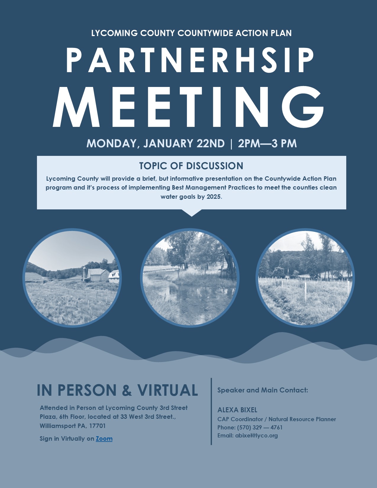 1/8/23 - We are thrilled to announce our Upcoming Countywide Action Plan (CAP) Partnership Meeting on January 22nd at 2:00 PM! This gathering will be held at the Lycoming County 3rd Street Plaza, 6th Floor, Located at 33 West 3rd Street, Williamsport, Pa, 17701. Virtual attendance is available on Zoom with the sign-on link attached in the flyer/agenda.