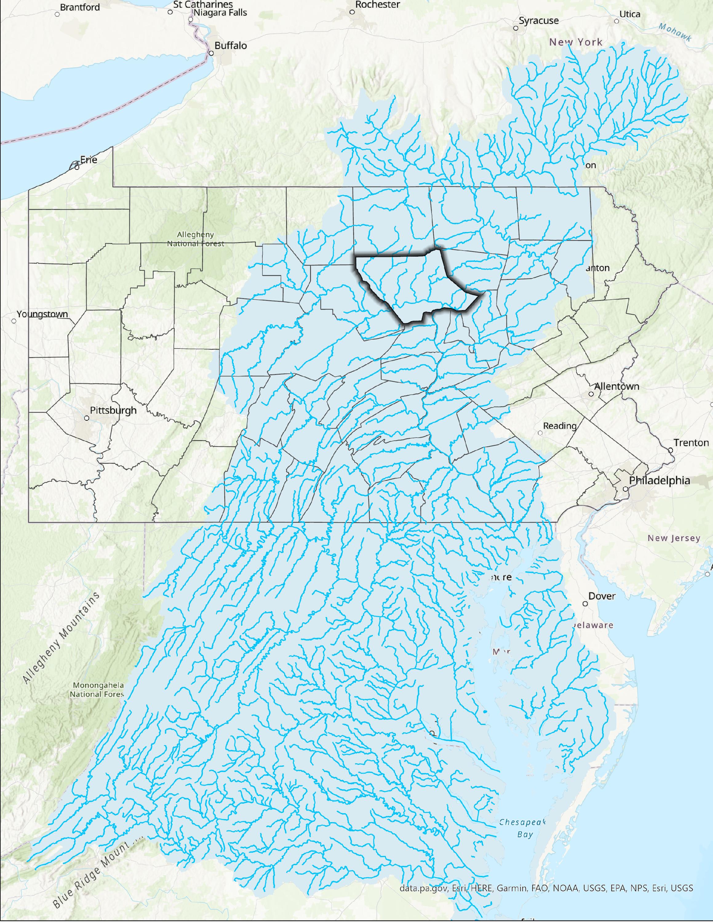 Lycoming County is just one of the forty-three Pennsylvania Counties to contain waterways that drain to either the Susquehanna or the Potomac rivers, which ultimately flow into the Chesapeake Bay.