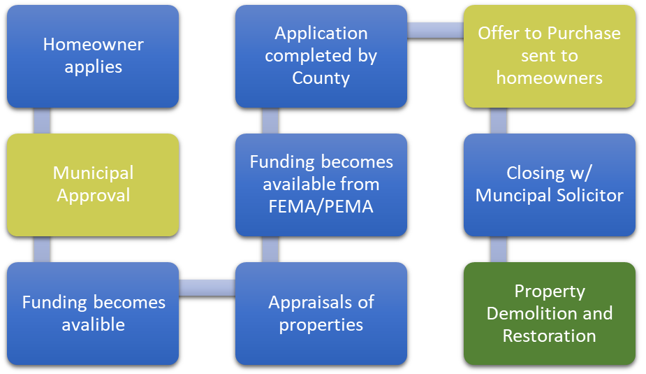 FEMA Acquisition/Demolition ProjectsProperty acquisition for open space, also known as Buyouts, allows property owners to receive Fair Market Value for their property while removing them from the hardships and risks associated with living in a floodplain. This process also allows for the property to be restored to natural floodplai,n reducing the risk of future flooding and decreasing the risk to life and property due to flooding.