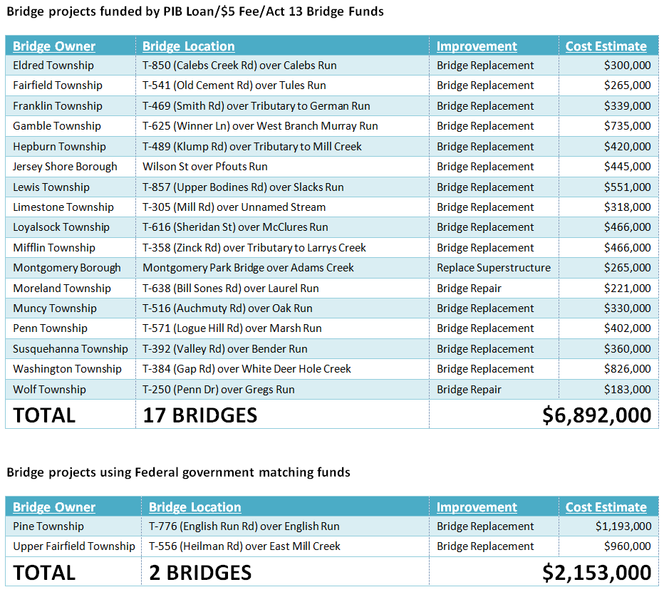 This is the first round of municipal owned structurally deficient bridges that will be repaired in a county-wide bridge bundling program. By bundling the bridge projects, multiple bridges can be designed and constructed concurrently rather than as single projects. It is anticipated that up to a 30% overall cost savings can be achieved along with a considerably shortened project duration using this innovative approach. The Lycoming County Board of Commissioners enacted a Fee for Local Use Ordinance as authorized under PA Act 89. As a result, PennDOT will collect an additional $5 for every non-exempt vehicle registered to an address in Lycoming County and these funds will be provided back to the county on a semi-annual basis. The Commissioners' intent is to use these funds to fix or replace the growing backlog of municipality-owned structurally deficient bridges located throughout the County. Other revenue sources provided through PA Act 13 dedicated to bridges will also be used to finance this program. This revenue will be used to pay the debt service on a PA Infrastructure Bank, (PIB) loan the county would seek with PennDOT approval. The loan will serve as up front financing to undertake the bridge repair program.