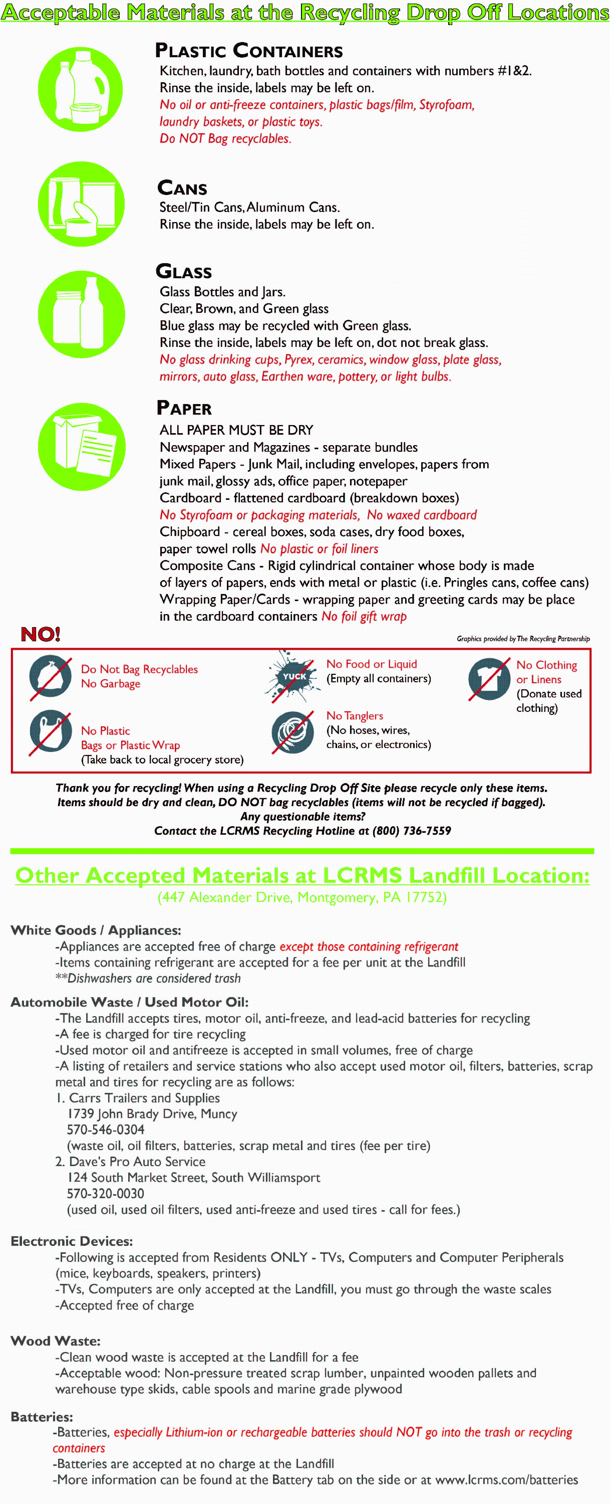 Battery Recycling Programs - https://www.call2recycle.org/locator/; www.lcrms.com/batteries