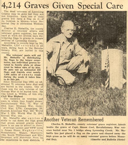 Charles E. Mahaffie, the county director of veterans’ affairs and veterans’ grave registrar, has been hard at work for several days distributing flags to graves in remote sections of Lycoming County.