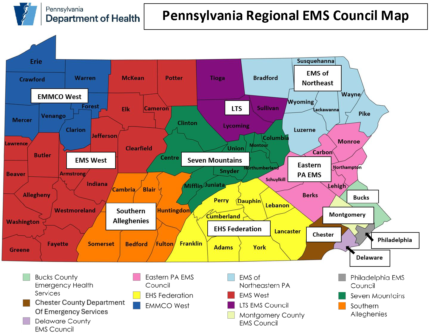 There are 13 Regional EMS Councils in the Commonwealth that administer the EMS Program for the Department of Health as promulgated by Pennsylvania's Act 37 which was signed into law on August 18, 2009 (Replacing Act 45 of 1984).
