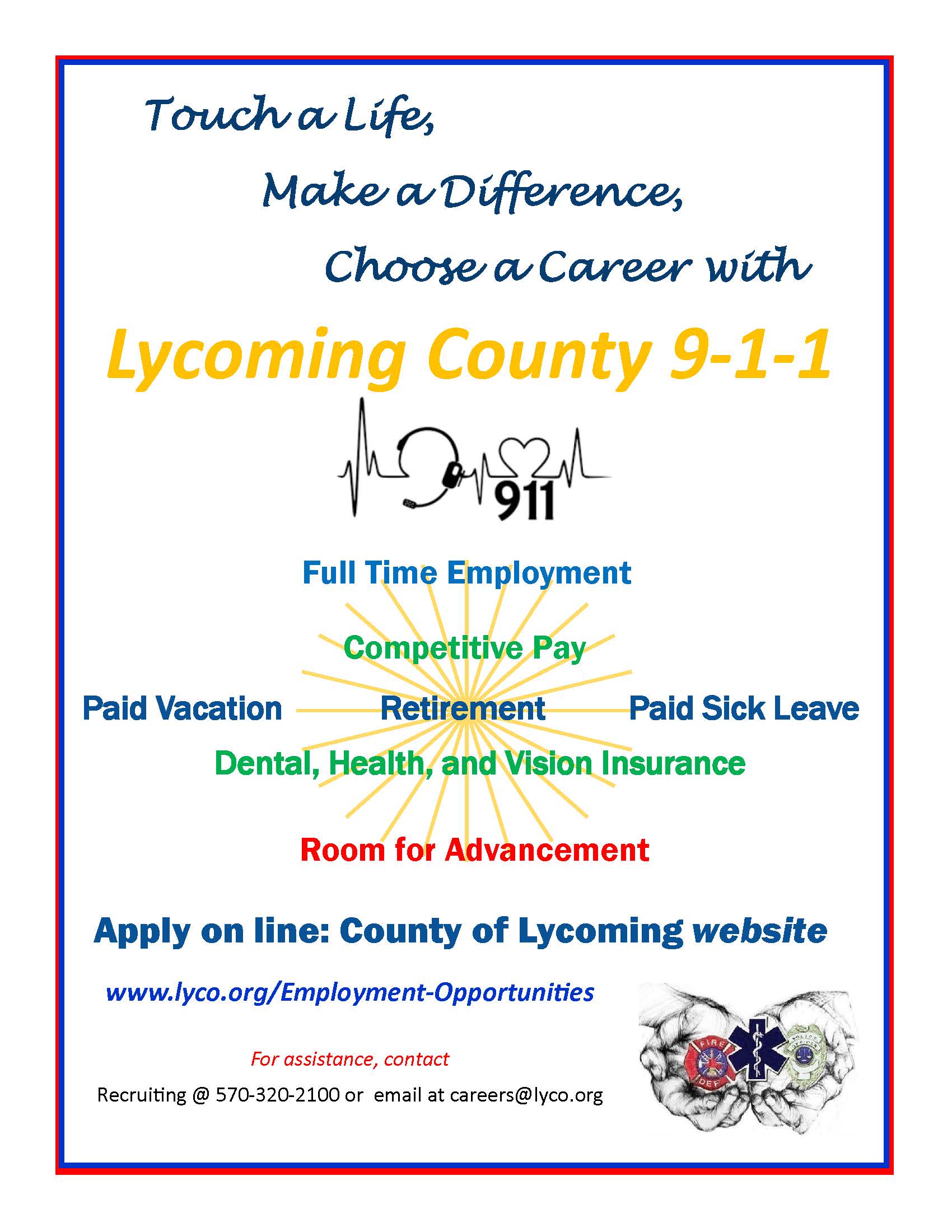 The Lycoming County Communications Center has been proudly serving the residents of Lycoming County since 1976. Located at the Lysock View Complex in Loyalsock Township, the Center provides a state-of-the-art communications system for Lycoming and Sullivan Counties. Telecommunicators dispatch 19 Law Enforcement Agencies, 38 Fire Departments, 30 BLS Ambulances, 10 Paramedic (ALS) units, and 52 Emergency Management Agency (EMA) Coordinators.